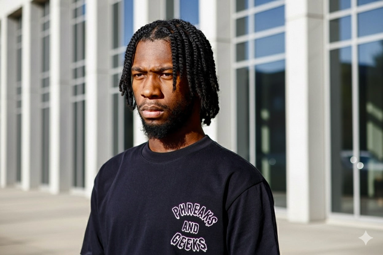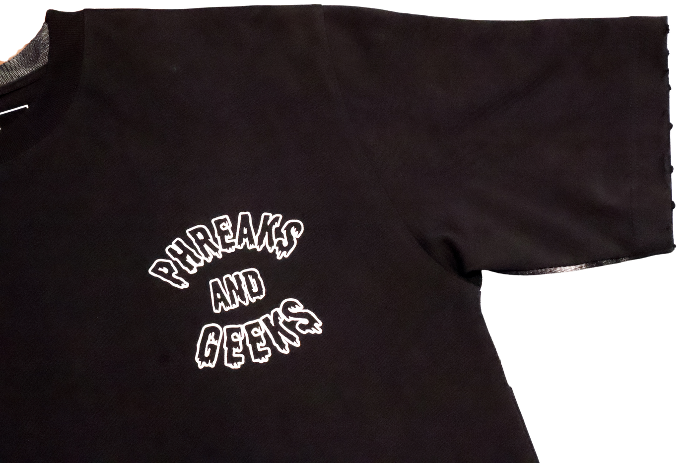 Shirt is made with custom heavy weight 8oz cotton, and finished with a distressed look, This garment features Phreaks and Geeks classic graphics screen printed on the chest and all over size print on back.